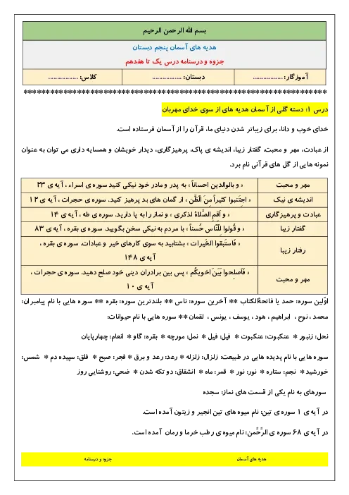 خلاصه درس و نکات مهم درس 1 تا 17 هدیههای آسمانی پنجم ابتدائی