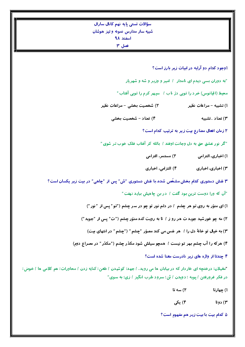 دانلود آزمون های مجموعه ای تستی درس فارسی فصل 3: سبک زندگی (درس 6 تا 8) پایه نهم با پاسخنامه